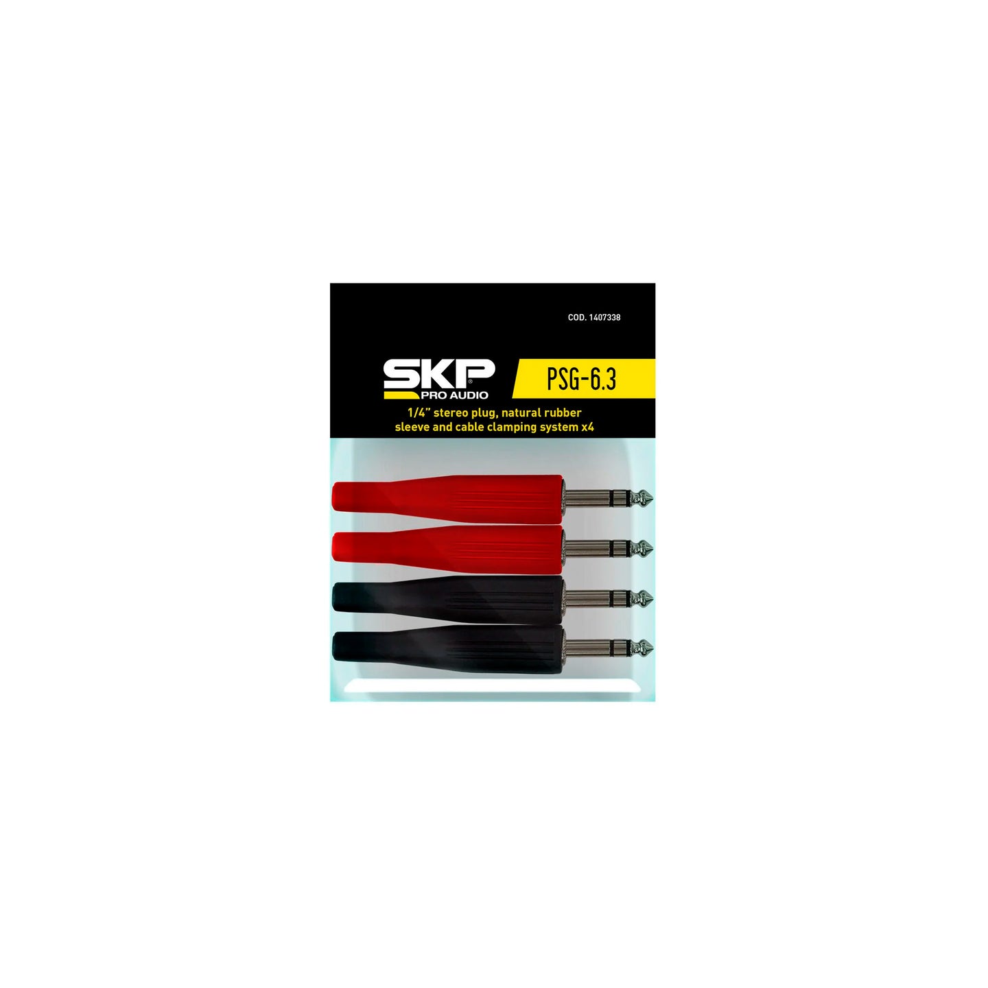 El PSG 6.3 de SKP es un kit de 4 conectores estero plug ¼ pulgadas (2 color rojo y 2 color negro) funda de caucho natural y sistema de sujeción de cables. Ideal para cables de parlantes, micrófonos, entre otros.