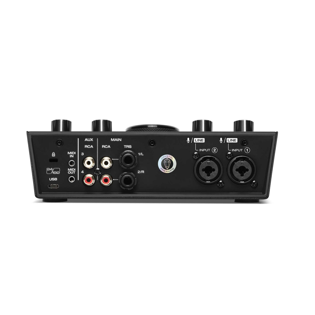 Las opciones de salida incluyen 2 salidas balanceadas de ¼” y 4 salidas RCA, con control USB/Direct y conmutador Mono/Stereo para máxima versatilidad al conectar monitores, mezcladores o equipos externos. También incorpora salida de auriculares con nivel independiente y ruteo conmutable. Conexiones MIDI integradas permiten conectar sintetizadores, controladores y otros dispositivos MIDI externos.