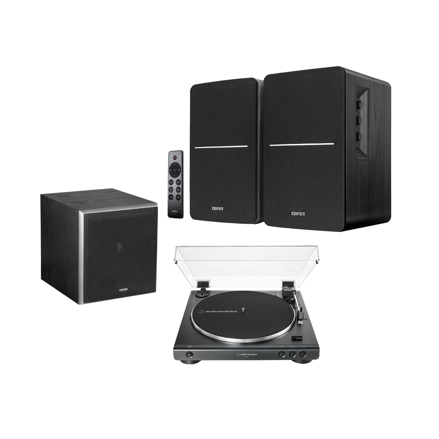Tornamesa Audio-Technica LP60X + Parlantes Edifier R1280DBs Negro + Subwoofer T5 | Bundle Experiencia Vinilo Emmett