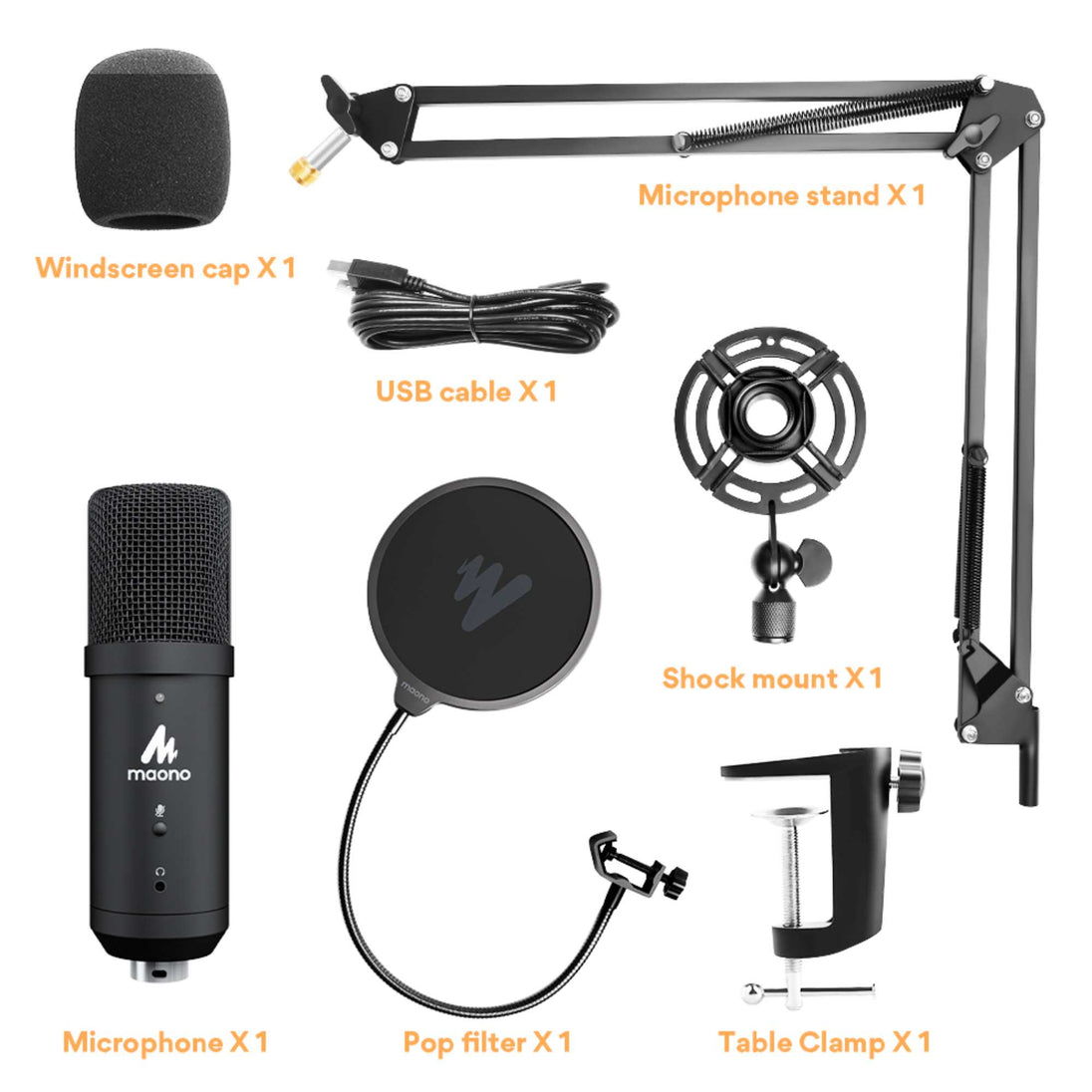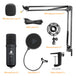 Incluye: brazo ajustable, soporte de choque metálico, abrazadera de mesa, filtro pop, parabrisas de espuma