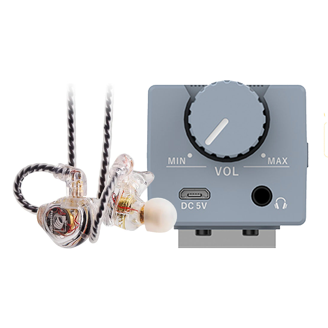Sistema de monitoreo personal ideal para músicos en vivo, salas de ensayo y home studio. Incluye audífonos intraaurales Relacart EA-225 y amplificador de audífonos Donner EM1.
